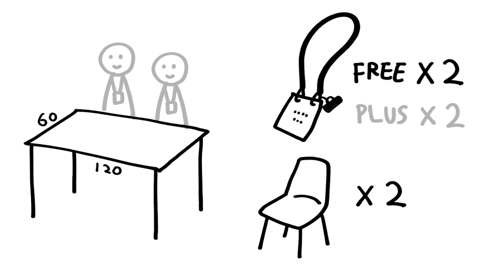 - 包括180x60cm枱一張,及椅子兩張。活動當日可申請加一張椅。