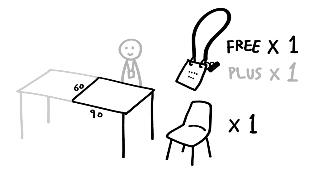 - 包括 180x60cm 枱半張(即 90x60cm 空間),及椅子一張。
